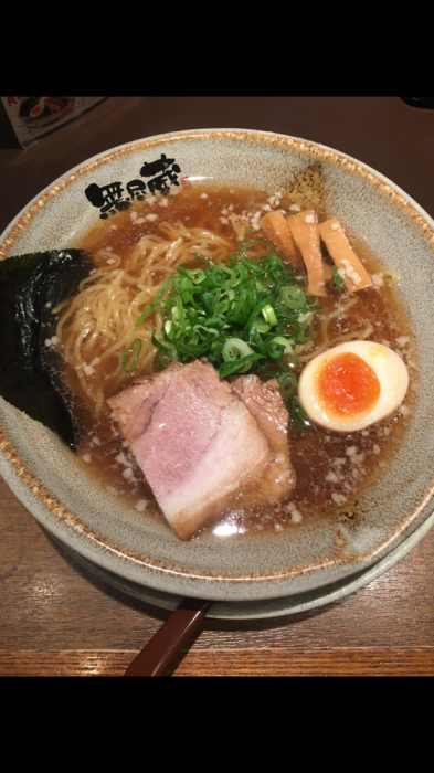 越後秘蔵麺無尽蔵花園家、豚骨醤油らーめん759円+餃子5個クーポン。チェーン店ですが、なかなかの豚骨醤油です。まろやかな豚骨スープに中太麺が合います。ラーパスクーポンで、餃子1皿(5個)が無料でした。