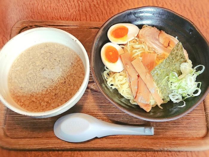 メニューは初志貫徹鴨だしつけ麺。背脂入り&めちゃめちゃ鶏風味の強い醤油スープはとても美味しく、つけ麺用の濃い味付けなのに美味しすぎて直で飲みたくなるほど!麺は珍しく細麺でプリっとした食感のものでした。これは好みですが個人的には太麺の方が好きかな?