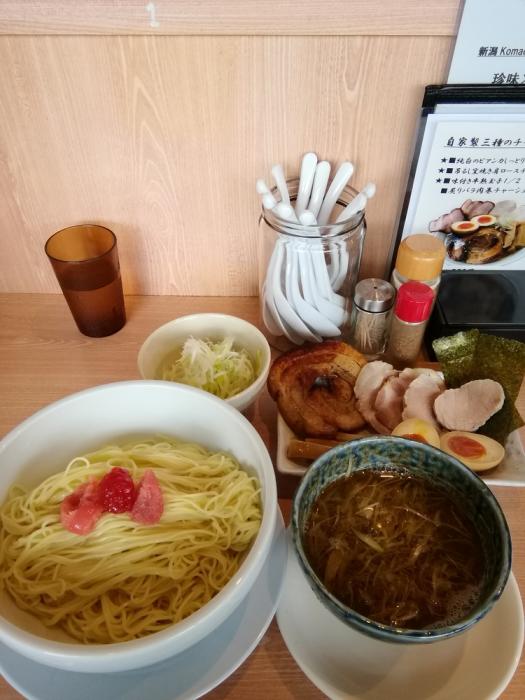 Komachiスタンプラリーコラボ麺の珍味×昆布水の淡麗つけ麺880円(特盛無料、クーポンネギトッピング)。写真にあった麺のどんぶりには昆布水が入っていて、割スープになると書いてあったのに、自分のどんぶりには、ほぐしにくい麺だけが…。具材とスープは抜群に美味しいのに、麺だけが残念。あと、人気店で混雑してるのはわかるんだけど、開店時に入って提供まで30分待ちって…。あれだけ旨いラーメンをつくるのにちょっと残念でした。
