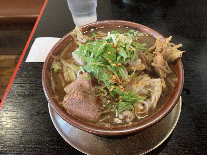 香ばしい味噌の香りが攻めてきます。唐辛子がトッピングで程よいピリピリ感、しっかり炒めた熱々の野菜が初をそそります。