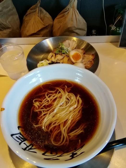中田製作所、【7月水曜日限定】豚骨清湯煮干そば~香重視系~850円。7月の水曜日限定2週目です。丼の上に具材が入った器が乗っています。丼は、麺想と書かれている厚手のもので、スープの表面の油で、熱々の麺とスープがいただけます。具材を投入しますが、全体的にあっさりしています。