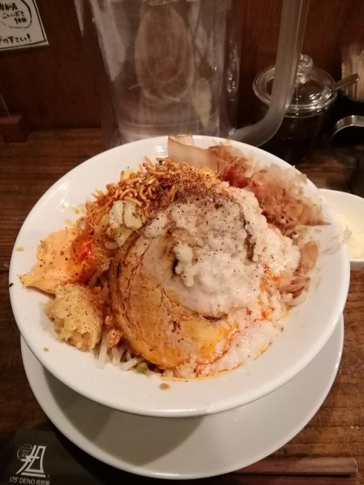 175°DENO担担麺、【夜限定】175郎(イナゴろう)1000円+チーズ増しクーポン。脂と野菜、痺れの量が選べます。脂増し、野菜増し、凄く痺れるにしました。二郎風のまぜそばですが、ベビースターラーメンなど具材が