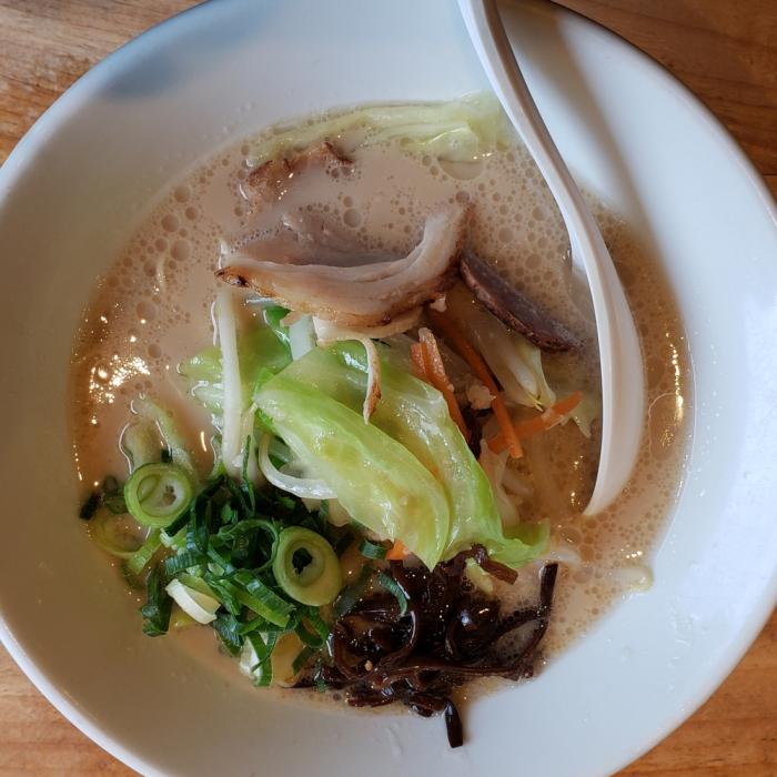 野菜が多いので替え玉なしでもお腹いっぱいになります。薬味の高菜で辛さ調節できるので味のバリエーションが増えます。クーポンで¥500はお得です。