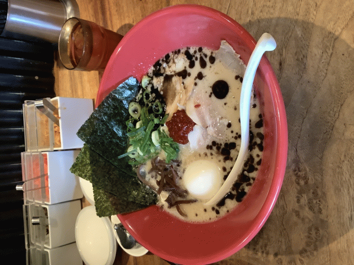 博多一風堂新潟店、特製赤丸1133円。値段は高めですが赤丸の濃厚な特製スープに、具材の全部乗せでお得感はあります。玉ねぎのみじん切りがアクセントになっています。