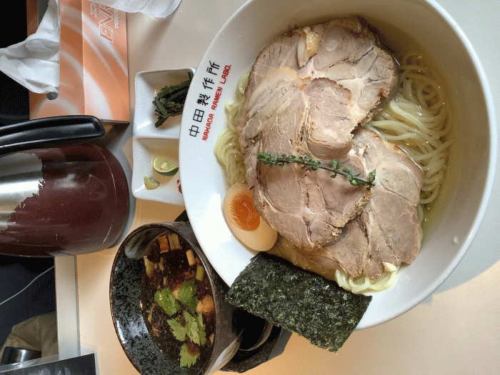 中田製作所、【5月水曜日限定】昆布水つけ麺(醤油ブラック)920円+チャーシュー2枚クーポン。5月の限定水曜日の最終週です。つけ汁は、塩と醤油を選べますが今回は醤油を選択。つけ汁の中には、穂先メンマ、ネギ、三ツ葉とチャーシューが入っています。個人的には、塩味が好みです。