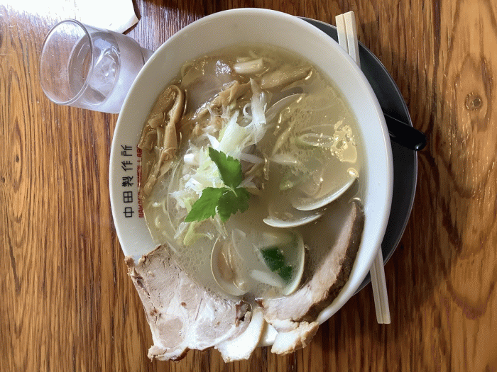 中田製作所、【10月水曜日限定】ハマグリと鶏の塩らーめん850円+チャーシュー2枚クーポン。10月水曜日第1週目は、9月に引き続き鶏貝塩シリーズ2種です。鶏と昆布がありますが、鶏を選択。相変わらず濃厚な魚介と鶏のスープ、具材は玉ねぎの代わりに長ネギ、それ以外は変わりありませんでした。なんといっても分厚いチャーシューが食べ応えがあって旨い。