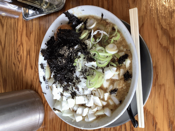 中田製作所、【期間限定】白子玉ねぎあご出汁背脂ブラック850円+玉ねぎ増し110円+ネギ増し60円+味玉クーポン。期間限定の白子玉ねぎあご出汁背脂ブラックです。甘い玉ねぎにあご出汁の効いたブラックスープが合います。ブラック好きにはたまらない組み合わせですが、やっぱりしょっぱいのでご飯が必須です。
