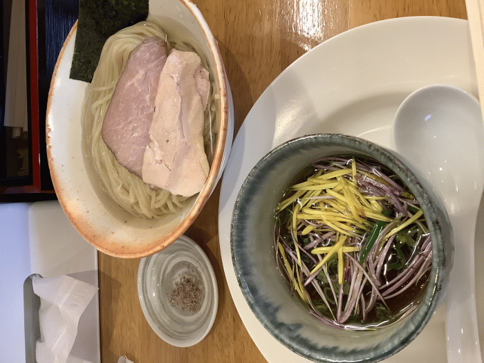 【初来店】KUBO LABO、【夏季限定】昆布水の濃密つけそば950円。これは旨い。今まで食べた昆布水系で一番。つけ汁がとにかく抜群、旨味をしっかり感じるつけそばでした。来店時は順番待ちの氏名を記入、雨天時は車種を記入で店員さんが車まで呼びにきてくれます。つけ汁も冷めたら温め直してくれる配慮、麺少な目は半玉付き。具材のかきのもとも全然クセがありません。
