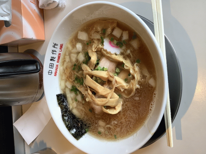 中田製作所、【8月水曜日限定】和風らーめん(魚介とんこつ)780円。8月水曜日第2週目も先週に引き続き、ライト豚骨、醤油とんこつ750円と和風らーめん780円の2種です。今回は、和風らーめんを選択、魚介系ライト豚骨スープに具材は、チャーシュー、穂先メンマ、玉ねぎ、海苔、ナルト、浅葱で、麺は中細麺です。