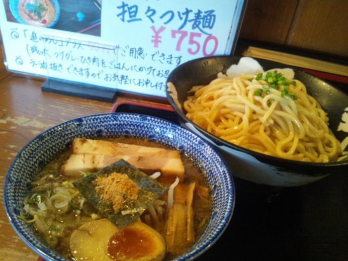 人気ですね!写真には坦々つけ麺のフリップが写り込んでしまっていますが、これは、つけ麺。こちらの特徴は、ラーメン同様にモヤシがけっこう入っている点でしょうか、好みは分れるかもしれませんが、私は好き。そこも含めて、こちらも太麺が美味しくて、好きなつけ麺のひとつです。