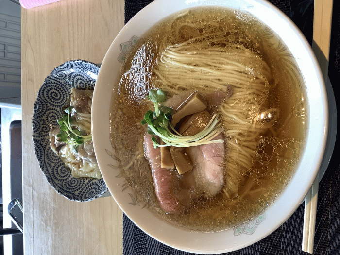 味処清水さんで、🐔鶏塩そば🍜と、チヤーシュー増加🍖🍖🍖🍖と、皿ワンタン🥟🥟🥟🥟🍱をいただきました。🐔鶏塩そ🍜🌱🌱🍖は、すっきりとした、琥珀色の澄んだスープに、綺麗なチー油が浮いていました。私は、茹で立ての熱々の、皿