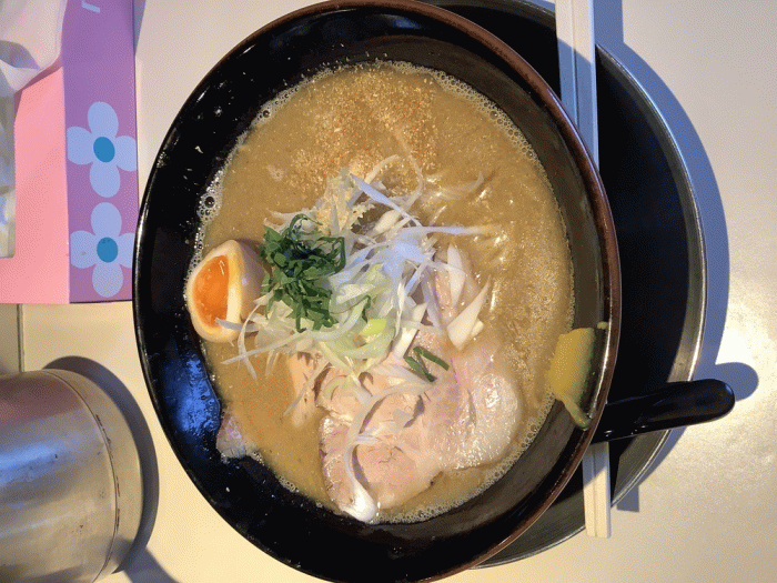 中田製作所、【6/14夜限定】鯖鶏ニボ白湯880円。ゲリラ的に行われる火曜日の夜限定です。提供時、丼から鯖の香りがします。濃厚なスープに、具材はシンプルにねぎと大葉、半玉、チャーシューです。自分好みの一杯です。