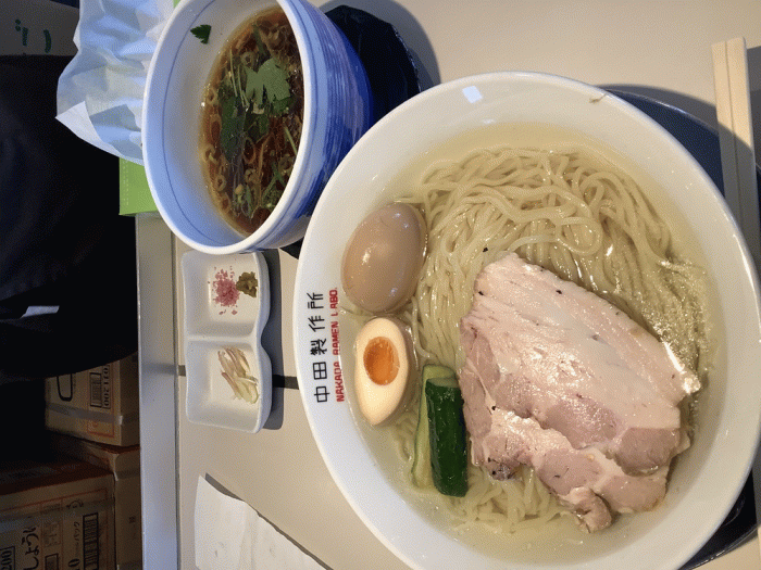 中田製作所、【8月水曜日限定】昆布水つけ麺900円+味玉クーポン。8月水曜日第1週目の限定は、昆布水つけ麺です。並々と張られた昆布水に麺、具材はラーメンには珍しいきゅうり、半玉、チャーシューが2枚、つけ汁には穂先メンマ、ねぎ、三つ葉、別皿でピンク塩、柚子胡椒、茗荷が提供されます。