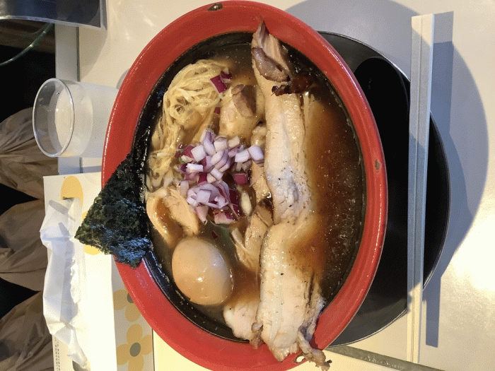 【10月水曜日限定】魚介豚骨清湯(醤油)〜炭火焼チャーシュー添え〜890円+チャーシュー増し210円+味玉110円。10月第1週目の限定は先月に引き続き魚介豚骨の清湯スープバージョンで、醤油か塩が選べます。先週よりも提供価格が若干上がっています。おすすめは「塩」の方でしたが、「醤油」を選択。麺は中細のストレート麺、具材は紫玉ねぎのみじん切り、青ねぎ、穂先メンマ、半玉、海苔、大きな炭火焼チャーシュー1枚です。