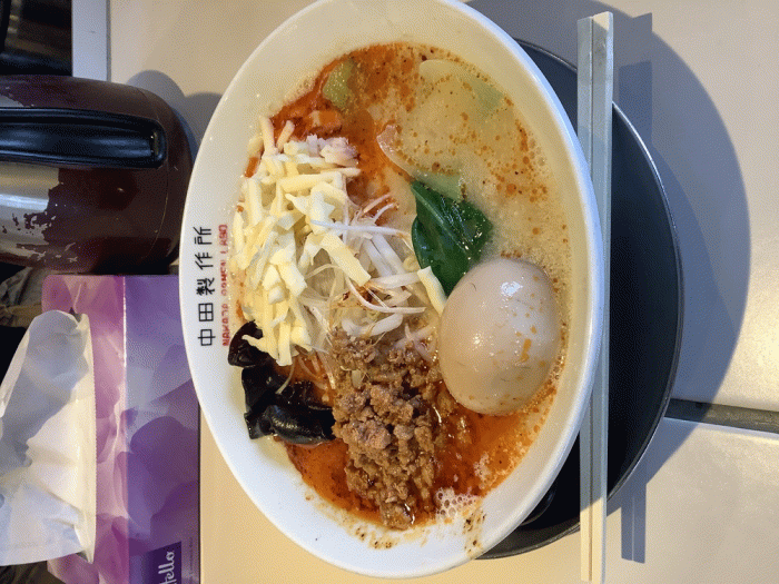 中田製作所、【1月水曜日限定】豚骨海老味噌担々麺900円+(モッツァレラ)チーズトッピング150円+味玉110円。1月第3水曜日の限定は、先週に引き続き豚骨海老味噌担々麺です。先週のメニューから、濃厚が取れてサラッとしたスープに麺は中太ちぢれ麺になりました。具材は一緒ですが、チーズトッピングがい4種類から選べます。①ヴィレッジ•オーク•ヴィンテージ•チェダー(イギリス)250円、②パルミジャーノ•レッジャーノ(イタリア)250円、③ペコリーノ•ロマーノ(イタリア)250円、④モッツァレラ(イタリア)150円。