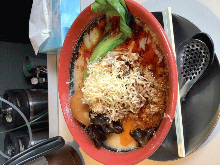 中田製作所、【1月水曜日限定】豚骨海老味噌担々麺900円+チーズトッピング(オールドダッチマスター)250円+味玉110円。1月第4週目の水曜日限定は、豚骨海老味噌担々麺です。チーズトッピングが3種類から選べます。①モッツァレラチーズ(イタリア)150円、②オールドダッチマスター(オランダ)250円、③ゴルゴンゾラ・ピカンテ(イタリア)250円。具材は先週と一緒ですが、パスタを想像させるビラビラの平打ち麺でスープと絡みやすくなっていました。