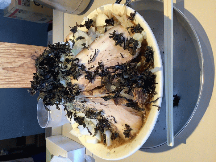 中田製作所、【6月水曜日限定】あご二郎1000円+味玉110円。6月第3週目の水曜日限定は、あごだしの二郎です。ニンニクと背脂が増し可能です。具材に白子玉ねぎと岩のりがトッピングされています。半麺で注文しましたが、もやし、キャベツなどボリューム満点でした。