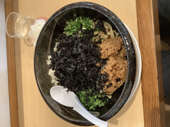 【初来店】麺屋かしん、まぜそば(追い飯付)850円+バラ海苔増し150円。器が大きくて混ぜやすく、具材もシンプルで食べやすい優しい味付けです。テーブルの調味料(ニンニク、酢、辛味など)で、味変可能です。追い飯無料で、多目の挽肉など残った具材に絡めてちょうどよくいただけます。
