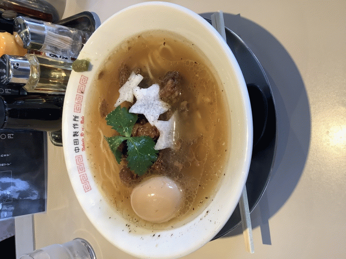 中田製作所、【期間限定】スタッフ亀山さんの牛骨塩らーめん1000円+味玉110円。第3回新潟県若手ラーメン職人グランプリにエントリーされた2/25(日)〜3/24(日)限定のラーメンです。あっさりした牛骨塩スープに中太麺、具材は牛スジ煮込み、星型大根、三ツ葉、柚子胡椒などです。
