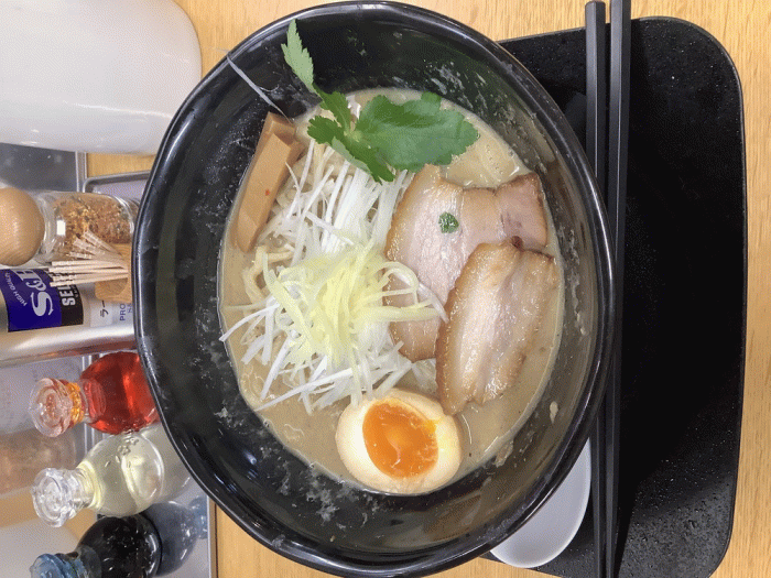 中華そば石黒、【期間限定】さばにぼ1100円。期間限定の「さばにぼ」1100円です。味噌さばにぼ1200円もあります。濃厚な煮干しスープに、鯖の身が溶け込んでおり、完飲するか、ライスと一緒に食べるのもおすすめです。青魚の生臭さを生姜が中和してくれます。