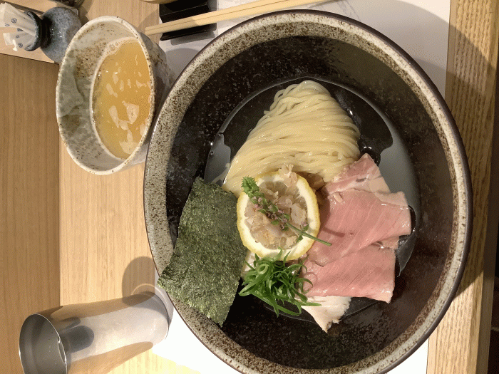 中華蕎麦おか部、【期間限定】ノドグロと鯵の昆布水つけそば(塩)1300円。期間限定のノドグロと鯵の昆布水つけそば(塩)です。注文時、醤油か塩が選択できます。好みで、藻塩も追加可能です。つけだれは、ノドグロと鯵の魚介の旨みが効いていて、具材のノドグロの細切れの刺身を投入しながら、麺と一緒に食べるのがオススメらしいです。