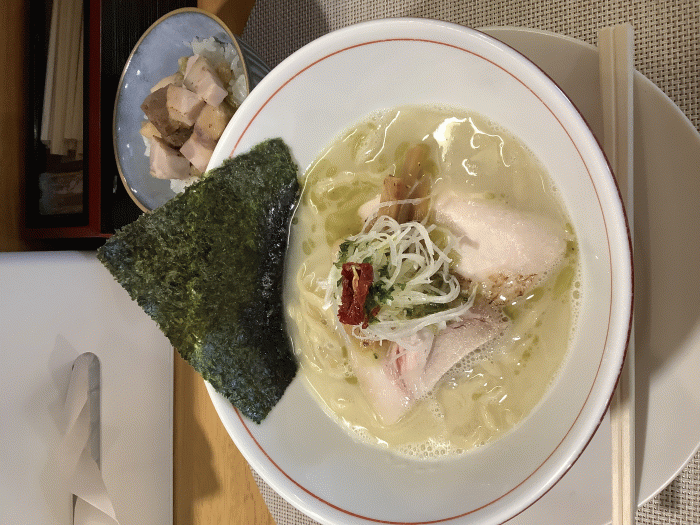 KUBO LABO、【11/3(日)6:00〜11:00限定】手揉み真鯛白湯そば(並盛)1000円+お肉ご飯400円。11月第1週目の日曜日朝ラー限定は、手揉み真鯛白湯そばと手揉み生姜塩そばの2種です。手揉み真鯛白湯そばを選択しました。とにかく旨い、濃厚な真鯛白湯スープに手もみ麺、ネギ、メンマ、板海苔、2種のチャーシュー、ドライトマトなどどれも絶品でした。