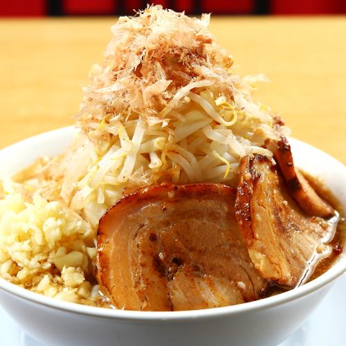 麺マッチョの人気No.1メニュー☆普通盛りでも麺200gのボリューム!!トッピング【野菜・にんにく・かつお・カラメ・あぶら】×【チョイマシ・マシ・マシマシ・バカマシ・マッチョマシ】はどれを選んでも無料!!腹ペコの学生もガッツリお腹を満たせます。