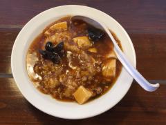 あっさりとした麻婆麺でした。餡としての麻婆はしっかりとしていて麺にも良く絡みますが、食べていくうちにスープの量の割合が多くなってくると麻婆が薄く感じました。もう少し最後まで麻婆を感じたかったです。
