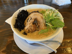 白味噌ベースのにんにくの効いたスープ、その後でふじのさん特有の魚介系がガツンときます。クーポンが発行されていて平日14時近くでしたが混んでいました。¥50のチャーシュー丼のチャーシューは結構な焦げ具合で少