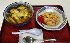 めおとラーメンは、キャベツ・ニラ・ヤングコーン・うずらの卵・刻んだザーサイがタップリと入り、中華醤油スープにザーサイが効いて美味いです・・・グリンピースの乗った五目チャーハンも美味い!!