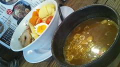 期間限定メニューです。米粉麺はまさしくもちもちで好い感じ。カレースープもしっかりとした中辛で卓上のいつものにんにく唐辛子を追加しての味変で2度美味しい。デフォの野菜トッピングも充実し滋養と強壮な秋ら
